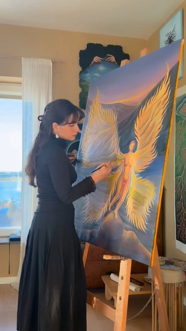In her artistic practice, she mediates dreams and visions, allowing the brush to move freely and images to reveal themselves, taking on a life of their own.